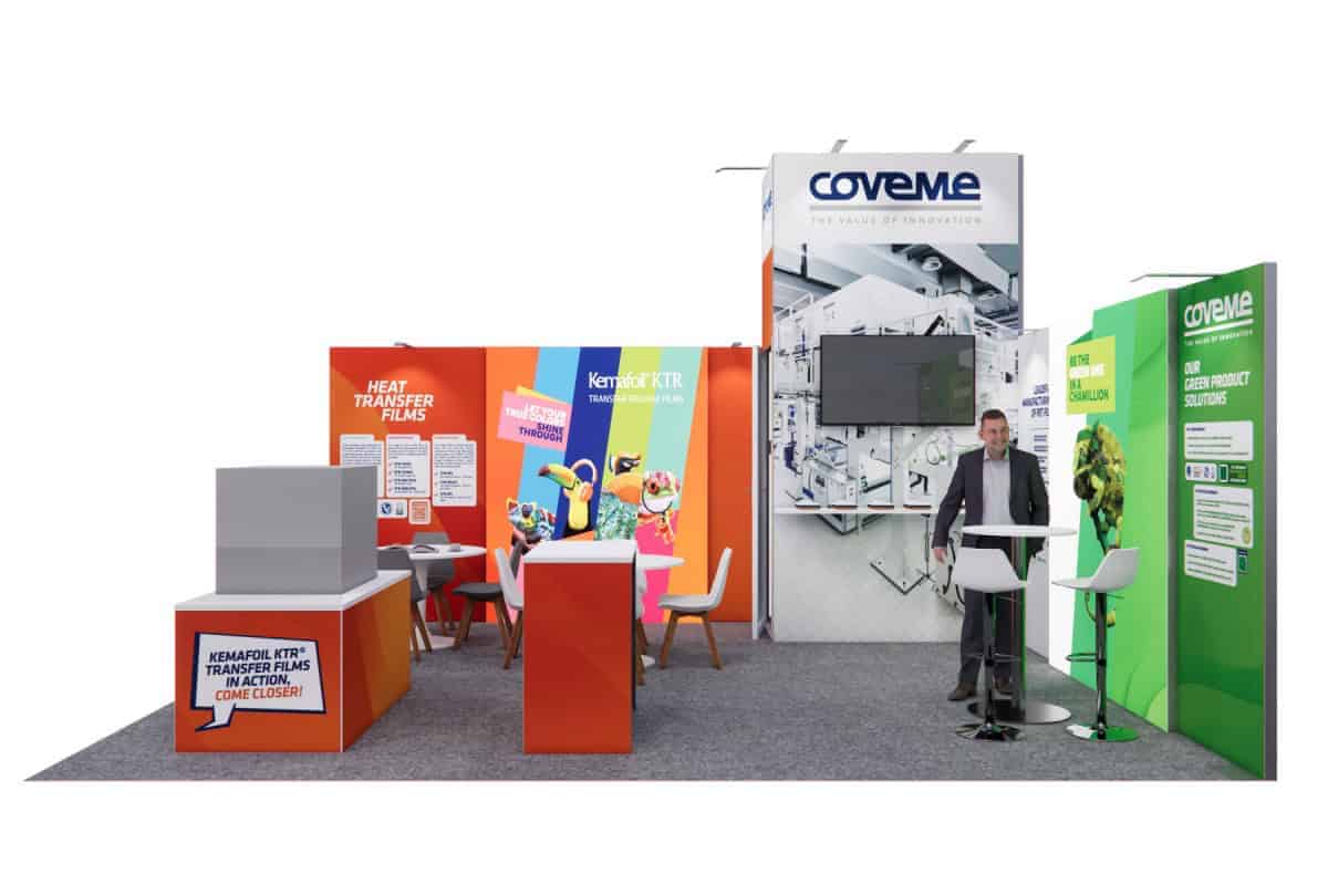 The fully customizable design allows companies to configure the floor, furniture and visuals to their liking, including options for LED frames and multimedia. This provides maximum freedom to tailor the booth to their own brand identity and needs.