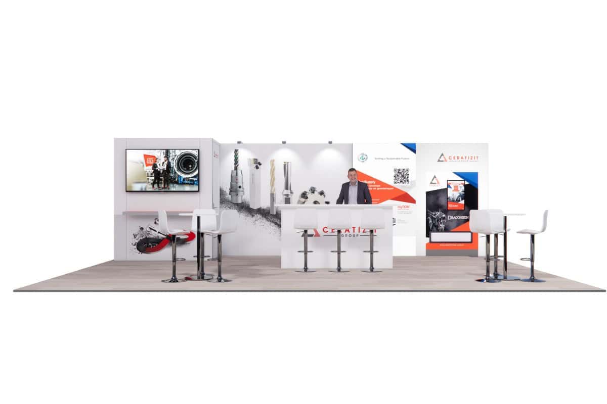 Customers can fully customize the booth with their own furniture, visuals and multimedia options, making each design unique and personalized. LED lighting and multimedia elements enhance the visual impact.