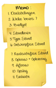 Beurswand a plus de 20 ans d’expérience dans le domaine de l’exposition et de la construction de stands et a réalisé de nombreuses expositions réussies pour des clients (internationaux) au cours de cette période. Nous nous ferons un plaisir de vous aider en vous donnant des conseils et des astuces utiles pour les salons, ainsi qu’une liste de contrôle pour une journée de salon réussie.
