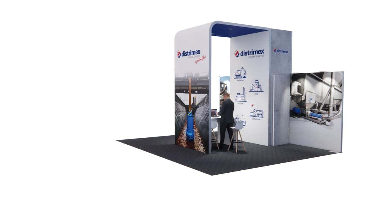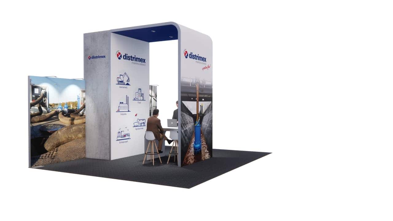 Ontdek ons opvallende Beursstand Design 52 en onderscheid uzelf op elke beurs. Met een indrukwekkende afmeting van méér dan 30 m2 biedt deze stand alle ruimte om uw merk in de spotlight te zetten. Als kopstand positioneert u zich prominent op de beursvloer, waardoor u gegarandeerd de aandacht trekt van voorbijgangers.